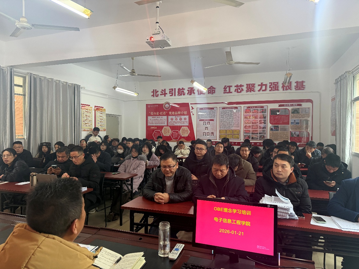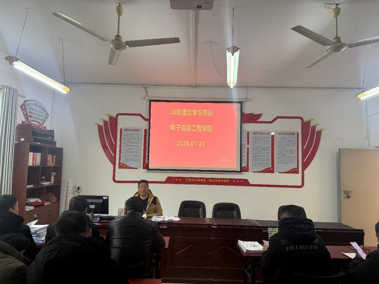 为深入贯彻落实高等教育高质量发展要求,全面推进成果导向教育(OBE)理念在教学实践中的落地生根,2026 年 1 月 21 日,电子信息工程学院组织召开 OBE 理念学习培训会。学院院长邹小金担任主讲人,全体教师齐聚会议室,共同参与这场聚焦教与学革新的专题培训,为学院教学质量提升注入新动能。