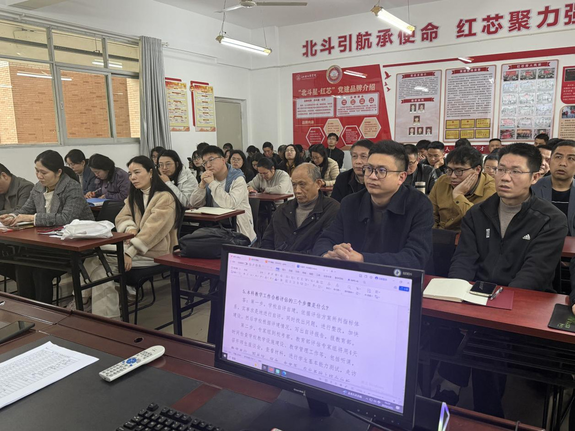 会议强调,迎接本科教学工作合格评估,关键在“学深悟透、对标落实、全员参与”。全体教师要准确把握评估指标体系和具体要求,进一步增强责任意识、质量意识和大局意识,把评估要求落实到日常教学、课程建设、实践教学、教学档案整理、学生管理服务等各个环节,做到以评促建、以评促改、以评促管、以评促强。要坚持问题导向,全面梳理学院在教育教学、实验实训、师资队伍建设、学风建设和育人成效等方面的短板弱项,逐项完善、逐项提升,确保各项工作经得起检验。