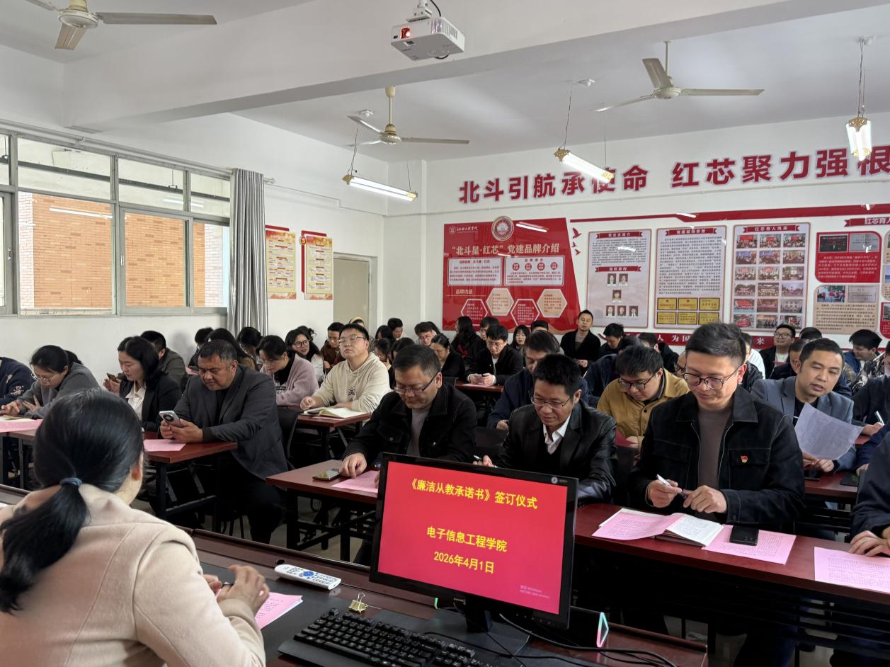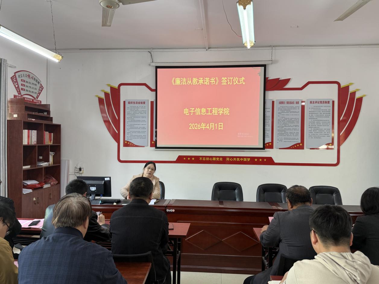为深入贯彻习近平总书记关于全面从严治党和党风廉政建设的重要论述以及关于树立和践行正确政绩观学习教育的重要讲话和重要指示精神,进一步加强师德师风建设,强化全体教师廉洁自律意识,筑牢拒腐防变思想防线,4月1日,电子信息工程学院在D201举行《廉洁从教承诺书》签订仪式。电子信息工程学院院长邹小金及学院全体教师参加活动,学院党总支书记陈小华主持仪式并作总结讲话。