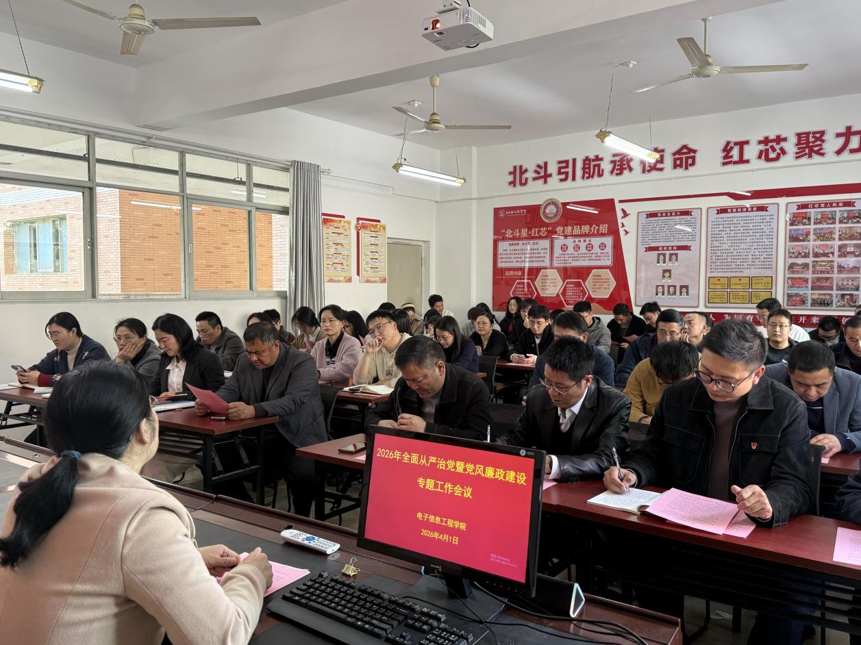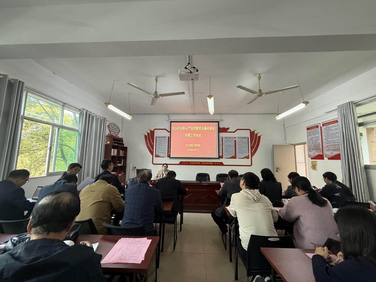 为深入学习贯彻习近平总书记关于党的自我革命的重要思想,进一步压紧压实全面从严治党主体责任,持续推进学院党建品牌建设走深走实,以高质量党建引领学院事业高质量发展,4月1日,电子信息工程学院在D201会议室召开2026年全面从严治党暨党风廉政建设专题工作会议。学院院长邹小金、学院全体教师参加会议,会议由学院党总支书记陈小华主持。此次会议紧扣全面从严治党和党风廉政建设主题,立足学院党建工作实际,聚焦“党建引领、作风护航、迎评促建、提质增效”目标要求,进一步统一思想、凝聚共识、压实责任,为学院党建品牌建设持续深化和本科教学质量合格评估工作有序推进提供坚强政治保障。